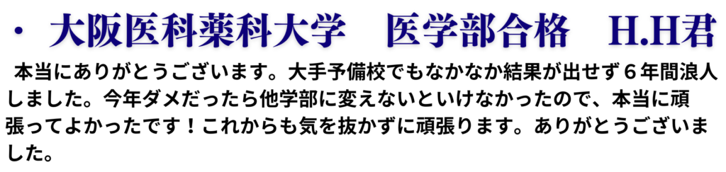 早稲田大学(理工)T.S君 同志社大学(工)K.Gさん 立命館大学(理工)Y.Yさん 独協医科大学(医)M.I君